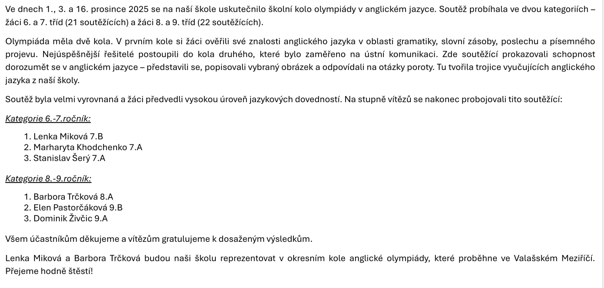 Školní kolo olympiády v anglickém jazyce